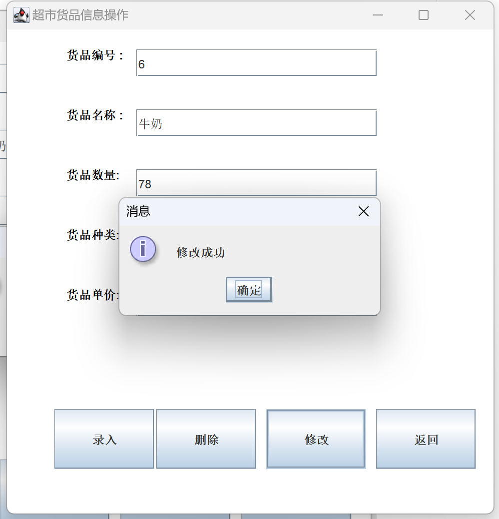 3、超市货品信息管理:对超市货品信息进行添加,修改,删除,查看操作