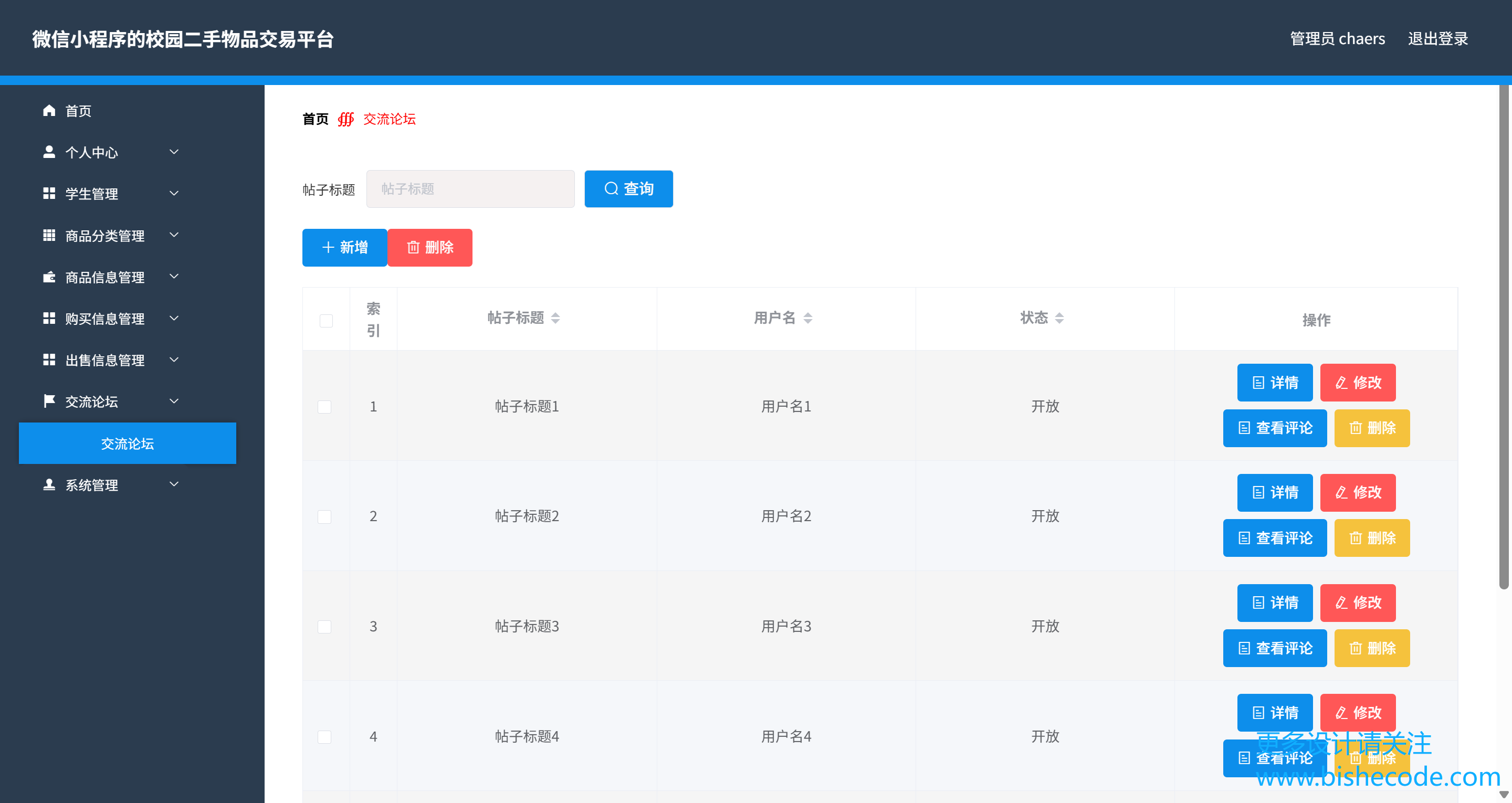8、交流论坛管理:管理员对交流论坛信息进行添加,修改,删除,查询,查看详情,查看评论操作